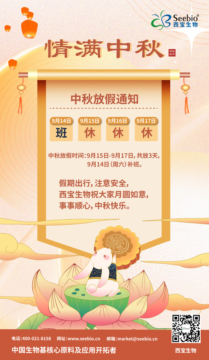 值此佳節(jié)之際,西寶生物也祝愿每一位員工,每一位客戶闔家團(tuán)圓,事事順心,中秋快樂!西寶生物中秋放假安排:9月15日-17日放假3天,9月14日調(diào)休補(bǔ)班。