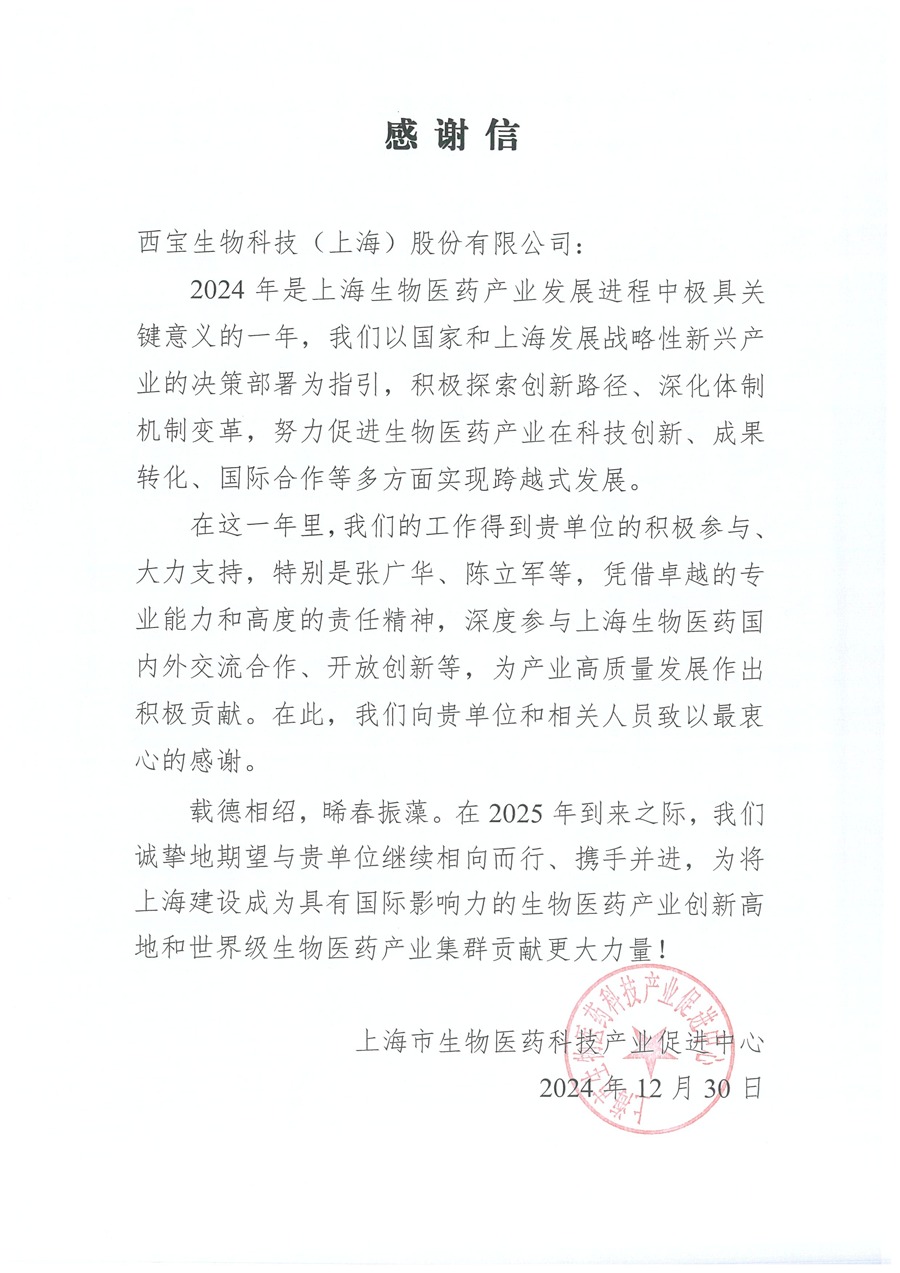 即將告別龍年,邁入嶄新的蛇年,在此之際,西寶生物收到一封來(lái)自上海市生物醫(yī)藥科技產(chǎn)業(yè)促進(jìn)中心特別的年終感謝信,紙箋傳情,雙向奔赴。