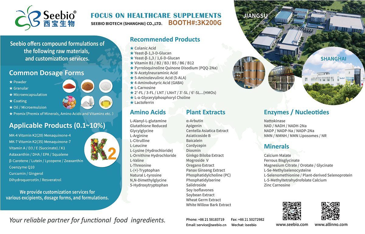 明星產(chǎn)品有維生素K2(MK4、MK7)、維生素E(succinate)/K1、維生素B12、番茄紅素、輔酶Q10、酵母β-1,3-D-葡聚糖、酵母β-1,3/1,6-D-葡聚糖、丙谷二肽、雙甘肽、地奧司明、牛至提取物、磷脂酰絲氨酸、大豆提取物、小麥胚芽提取物、納豆激酶、NMN、NR、檸檬酸鎂、乳清酸鎂、L-硒代蛋氨酸、乳清酸鉀等,期待與您的雙向奔赴!讓我們攜手共進,在這行業(yè)的大舞臺上,一同挖掘新機遇,開拓新市場,走向國際,創(chuàng)造新輝煌!西寶生物3K200G展位,盼您蒞臨!