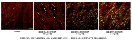 文獻(xiàn)表明* :重組III型人源化膠原蛋白與細(xì)胞外基質(zhì)(ECM)進(jìn)行整合后8周,可觀察到其顯著促進(jìn)組織的I型、III型膠原蛋白的再生,加入的濃度不同,再生作用也表現(xiàn)出差異: