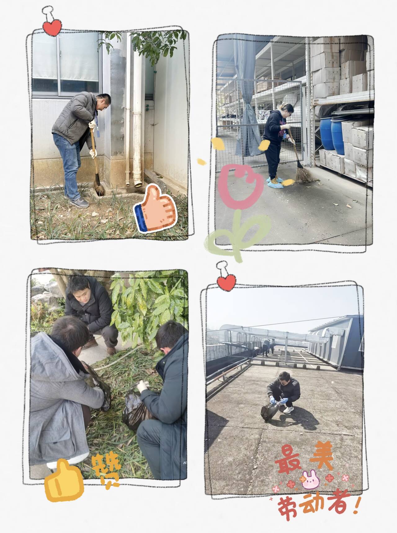 各部門同事們紛紛響應(yīng)號(hào)召,如同一股股清泉匯聚,大家秉持著不怕臟、不怕累的熱忱,以昂揚(yáng)的斗志投入打掃中。看,那在樓頂清掃的同事,宛如大樓“美容師”,專注地拂去每一絲塵埃,讓樓頂在陽(yáng)光的照耀下熠熠生輝;而清理倉(cāng)庫(kù)周邊雜草的同事們,正在拔除歲月滋生的雜亂,為倉(cāng)庫(kù)周邊重塑整潔輪廓。在這場(chǎng)大掃除里,每個(gè)人都是主角,齊心協(xié)力為公司區(qū)域的每一寸土地注入清新與活力。大家在共同勞作中,深切體會(huì)到維護(hù)公司公共環(huán)境的責(zé)任之重,那份強(qiáng)烈的責(zé)任感與使命感,如同璀璨星辰,照亮了企業(yè)環(huán)境建設(shè)的前行之路。