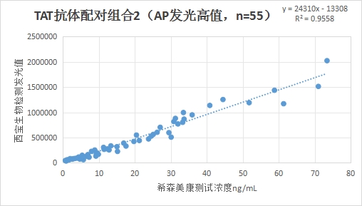 西寶TAT抗體配對組合2(<20 ng/mL)的發(fā)光值與希森美康 TAT發(fā)光試劑賦值臨床相關性R2在0.88左右。