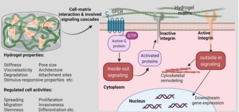 聚乙二醇(PEG)基水凝膠作為可調(diào)控的三維網(wǎng)絡(luò)結(jié)構(gòu),通過其可變的理化性質(zhì)(如交聯(lián)方式)介導(dǎo)細(xì)胞與基質(zhì)的相互作用,提供動(dòng)態(tài)微環(huán)境,而化學(xué)交聯(lián)(如共價(jià)鍵)增強(qiáng)機(jī)械穩(wěn)定性,從而觸發(fā)信號(hào)級(jí)聯(lián),調(diào)控細(xì)胞粘附、遷移及分化等行為。