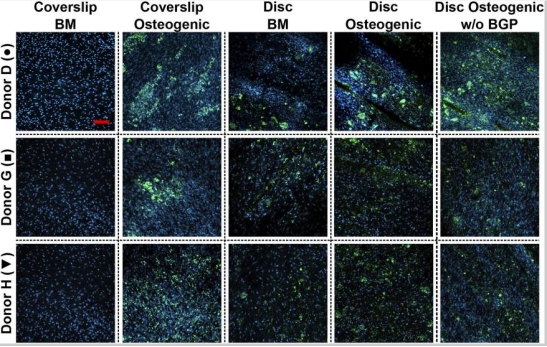 圖:人骨髓間充質(zhì)干細胞的骨細胞礦化熒光共聚焦圖像拍攝于第28天,比例尺:200微米【1】
