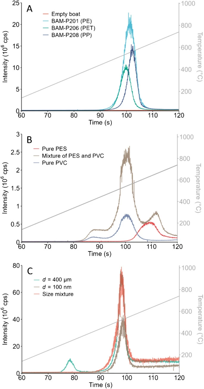 研究人員首先評估了ETV作為熱解單元對不同聚合物的適用性。如圖2A所示,PE、PET和PP三種微塑料標(biāo)準(zhǔn)材料在440-590°C溫度區(qū)間內(nèi)均產(chǎn)生明顯的13C+信號峰,且背景信號穩(wěn)定(相當(dāng)于0.53 μg碳含量)。雖然檢測溫度比文獻(xiàn)報道的熱解溫度高約100 K,但這主要?dú)w因于ETV系統(tǒng)的加熱持續(xù)時間和樣品傳輸延遲。為驗(yàn)證方法對寬熱解溫度范圍聚合物的適用性,團(tuán)隊(duì)選取聚氯乙烯(PVC)和聚醚砜(PES)進(jìn)行測試。如圖2B所示,PVC在340-600°C呈現(xiàn)雙峰(對應(yīng)其兩步熱解機(jī)制),PES在600-740°C出峰,混合物測量成功覆蓋了全部熱解溫度范圍。