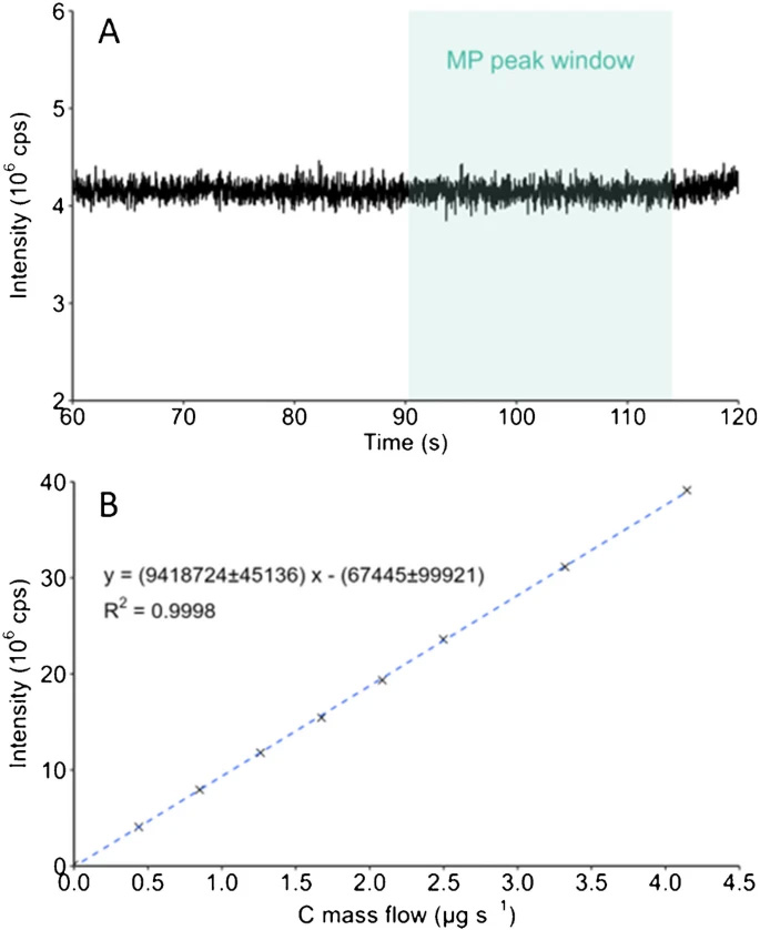 研究團(tuán)隊(duì)采用的核心技術(shù)方法包括:1)石墨管型電熱蒸發(fā)系統(tǒng)(ETV-4000d)與四極桿ICP-MS(iCAP Qc)的聯(lián)用配置,通過優(yōu)化溫度程序(100-800°C,升溫速率10 K/s)實(shí)現(xiàn)聚合物可控?zé)峤猓?)基于ISO 6142標(biāo)準(zhǔn)制備的CO2/Ar混合氣體(1.104347% CO2)的動態(tài)稀釋校準(zhǔn)系統(tǒng),通過質(zhì)量流量控制器精確調(diào)節(jié)碳質(zhì)量流量,建立13C+信號的線性校準(zhǔn)曲線;3)使用聚乙烯(PE)、聚丙烯(PP)、聚對苯二甲酸乙二醇酯(PET)等微塑料標(biāo)準(zhǔn)物質(zhì)(BAM-P201、BAM-P206、BAM-P208)進(jìn)行方法驗(yàn)證,并以標(biāo)準(zhǔn)化土壤(LUFA 2.3,有機(jī)碳含量0.75%)為真實(shí)基質(zhì)進(jìn)行加標(biāo)實(shí)驗(yàn)。