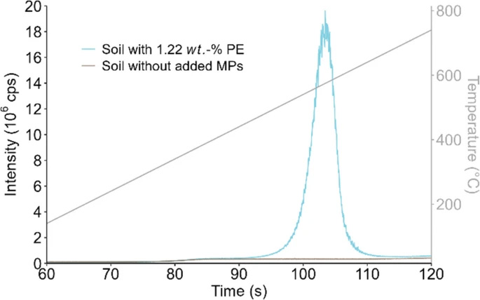 為驗(yàn)證方法在實(shí)際環(huán)境樣品中的應(yīng)用能力,研究團(tuán)隊(duì)在標(biāo)準(zhǔn)土壤LUFA 2.3中進(jìn)行PE加標(biāo)實(shí)驗(yàn)(約2 wt.%)。如圖4所示,盡管土壤本身有機(jī)碳含量(0.75%)會產(chǎn)生背景信號,但在微塑料特征熱解溫度區(qū)間(440-590°C),背景信號相對穩(wěn)定,PE微塑料的13C+信號峰清晰可辨。通過基線校正和峰積分處理,測得PE在土壤中的回收率為91.2%,與純物質(zhì)測量結(jié)果相當(dāng)。