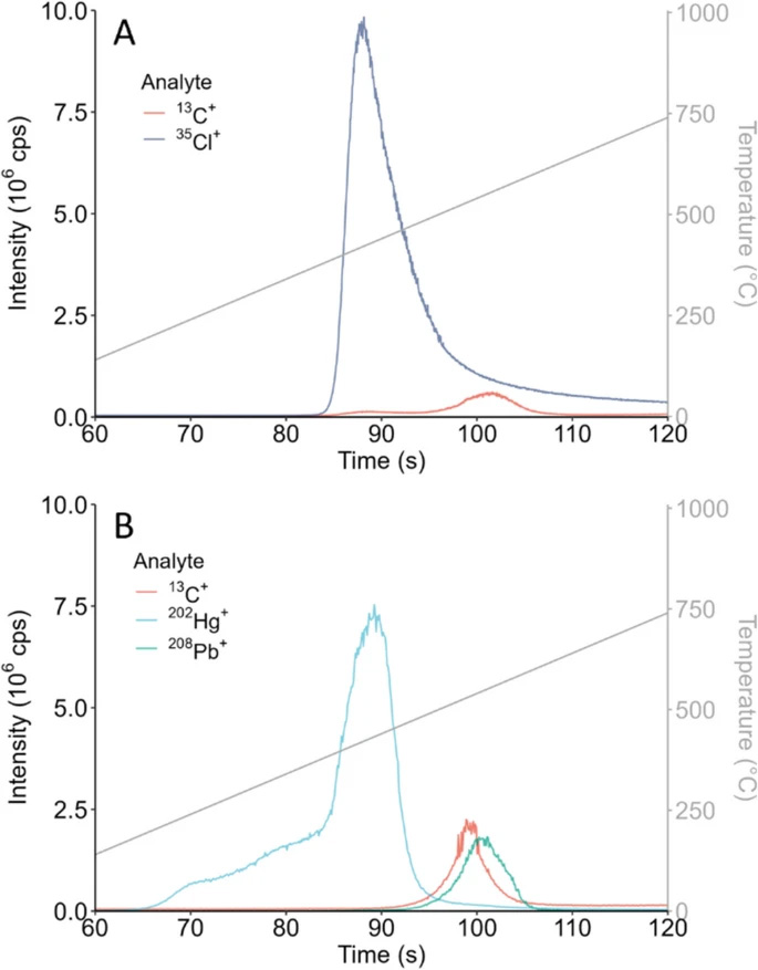 此外,研究團(tuán)隊(duì)還驗(yàn)證了方法對塑料添加劑的檢測能力。使用含汞氧化物和硬脂酸鉛的ABS標(biāo)準(zhǔn)物質(zhì)(BAM-H010)進(jìn)行測試,結(jié)果顯示汞和鉛的信號峰與聚合物熱解峰部分重疊但存在時間偏移(圖5B),表明添加劑檢測更多受物質(zhì)本身沸點(diǎn)和與聚合物相互作用的影響,這為評估微塑料的生態(tài)毒性風(fēng)險提供了新視角。