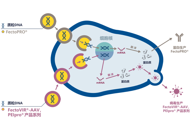在各階段的病毒載體生產(chǎn)過程中,均可提供相應(yīng)質(zhì)量級別的PEIpro&reg;轉(zhuǎn)染試劑