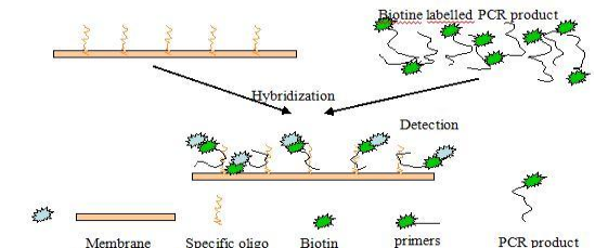 其主要原理是,利用短的寡核苷酸序列作為探針,并點(diǎn)到硝酸纖維素膜或尼龍膜上,再將待測(cè)的DNA樣本(一般是經(jīng)PCR特意性擴(kuò)增的產(chǎn)物,在PCR引物5’端預(yù)先進(jìn)行生物素標(biāo)記,使擴(kuò)增產(chǎn)物相應(yīng)標(biāo)記有生物素)與之雜交,形成穩(wěn)定的雙鏈結(jié)構(gòu),如果目標(biāo)序列中存在變異,那么探針與目標(biāo)序列的雜交將會(huì)收到影響,導(dǎo)致雜交信號(hào)的變化。通過在不同位置固定數(shù)十甚至數(shù)百種等位基因,只需要一次雜交,就可以實(shí)現(xiàn)多種等位基因的篩查。