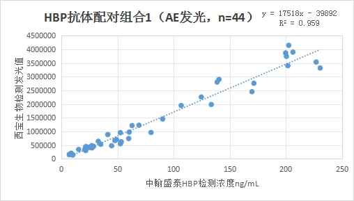 西寶生物發(fā)光(AE)平臺HBP抗體配對組合1與中翰盛泰HBP試劑(熒光免疫層析)賦值的臨床樣本相關性R2在0.95左右,相關性較好。
