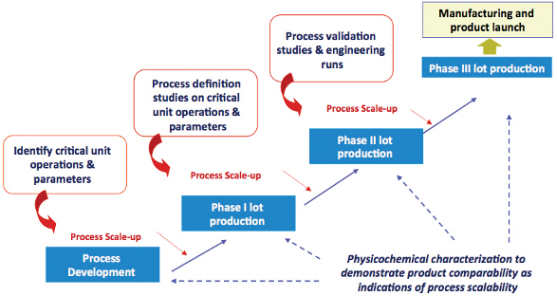 疫苗產(chǎn)品多樣且復(fù)雜,包括滅活或解毒疫苗;重組蛋白疫苗;腺病毒疫苗;及治療性疫苗等,圖1描述了原料藥疫苗工藝開發(fā)的通用方法。工藝開發(fā)從實(shí)驗(yàn)室規(guī)模開始,用于確定單元操作和參數(shù),然后逐步擴(kuò)大規(guī)模(通常在20L發(fā)酵或細(xì)胞培養(yǎng)下),用于生產(chǎn)用于I期臨床研究的GMP材料。在擴(kuò)展到200 L(通常用于第二階段)之前,使用實(shí)驗(yàn)設(shè)計(jì)(DoE)對關(guān)鍵單元操作和參數(shù)進(jìn)行過程定義研究。在第三階段(約2000L規(guī)模)之前,需要進(jìn)行工藝驗(yàn)證和工程運(yùn)行。在工藝開發(fā)和放大過程中,進(jìn)行生物物理和化學(xué)表征,以證明產(chǎn)品的可比性和工藝可擴(kuò)展性。
