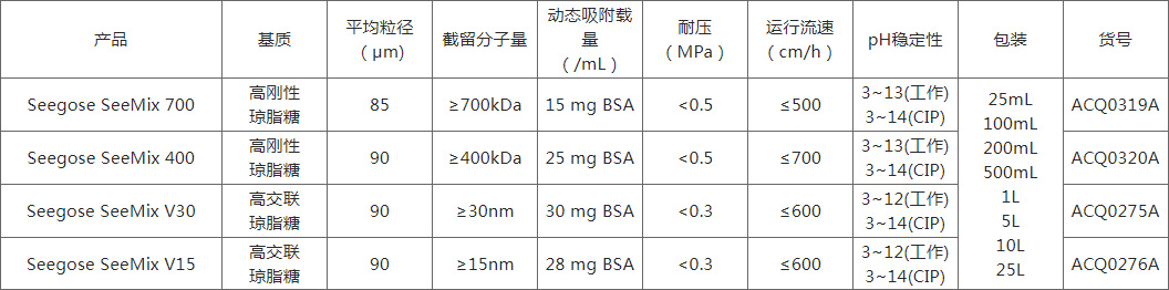 Seegose SeeMix V30 | 高交聯(lián) 瓊脂糖 | 90 | ≥30nm | 30 mg BSA | <0.3 | ≤600 | 3~12(工作) 3~14(CIP) | ACQ0275A | |
