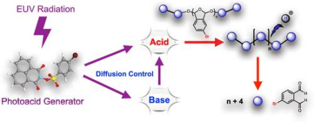 光酸的擴(kuò)散長度直接決定了光刻膠的性能及一些重要參數(shù),如曝光能量、能量窗口、邊緣粗糙度、圖形形貌以及掩模版誤差增強(qiáng)因子等。