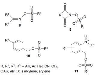 這類化合物中重要的是磺酸酯,它在光照下會產(chǎn)生強(qiáng)酸。他們包括亞氨基磺酸鹽 (化合物8), 酰亞胺磺(化合物9) 和芐基磺酸鹽(化合物10) 。在苯磺酸鹽中,只有對硝基和鄰硝基苯基磺酸酯(化合物11)在光照下產(chǎn)生酸[7],這些異構(gòu)體通過不同的機(jī)制產(chǎn)生光酸。非離子型PAG在有機(jī)溶劑和聚合物薄膜中具有較高的溶解度,但與鎓鹽相比,它們的熱穩(wěn)定性較差(可以通過進(jìn)一步的化學(xué)修飾進(jìn)行改進(jìn))。
