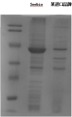 下圖數(shù)據(jù)為Seebio-21菌在不同培養(yǎng)基中的目標蛋白表達情況,泳道“Seebio”代表培養(yǎng)基中添加Seebio品牌胰蛋白胨+酵母粉,泳道“某進口品牌”代表培養(yǎng)基中添加某進口品牌蛋白胨和酵母粉,通過SDS-PAGE電泳進行結(jié)果顯示,Seebio品牌胰蛋白胨+酵母粉組合表達效果優(yōu)于某進口品牌組合。