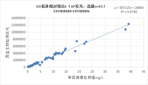 西寶DD抗體配對(duì)組合3(<40mg/L)的發(fā)光值與希森美康DD試劑臨床相關(guān)性R2>0.95。