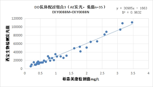 西寶DD抗體配對(duì)組合3(<4mg/L)的發(fā)光值與希森美康DD試劑臨床相關(guān)性R2>0.95;