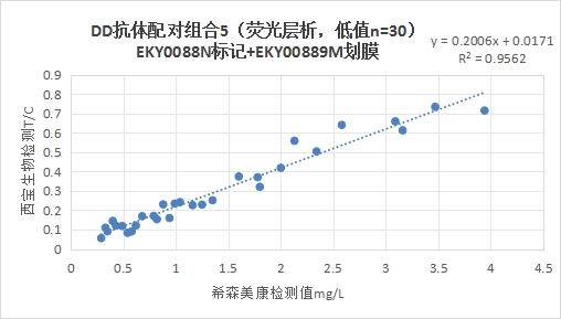 西寶DD抗體配對(duì)組合5(<4mg/L)的發(fā)光值與希森美康DD試劑臨床相關(guān)性R2在0.95左右;
