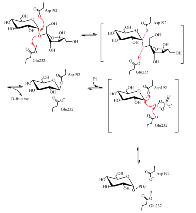 蔗糖磷酸化酶與GH13家族的其他酶一樣,在反應(yīng)時(shí)遵循雙重置換機(jī)制。2個(gè)羧基氨基酸(在BaSP中為Asp192和Glu232,對(duì)應(yīng)于LmSP中的Asp196和Glu237)在雙重置換機(jī)制中起著關(guān)鍵作用,而且這2個(gè)催化殘基完全保守。Asp192 (催化親核試劑)攻擊異頭碳,同時(shí)Glu232 (一般酸/堿催化劑)將糖苷鍵的氧質(zhì)子化,隨后形成共價(jià)糖基酶中間體和釋放果糖。如圖 2所示,在受體位點(diǎn)發(fā)生構(gòu)象變化后,中間體可與不同的受體底物(水、無(wú)機(jī)磷酸、糖等)反應(yīng),釋放出糖苷產(chǎn)物。值得注意地是,水解作為副反應(yīng)總是存在[1]。