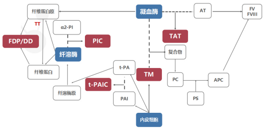 凝血酶生成是靜脈血栓形成的關(guān)鍵環(huán)節(jié), TAT是凝血酶與抗凝血酶Ⅲ(ATM)1:1結(jié)合形成的復(fù)合物,可作為凝血酶生成的分子標(biāo)志物,直接證實凝血系統(tǒng)的活化,反映凝血酶水平,是凝血系統(tǒng)激活的標(biāo)志物。其半衰期為3~15min。