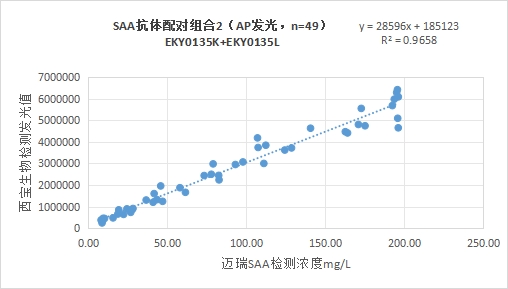 西寶生物發(fā)光平臺SAA抗體配對組合2與邁瑞醫(yī)療SAA試劑(免疫比濁法)試劑賦值的臨床樣本相關(guān)性R2>0.95,相關(guān)性良好。