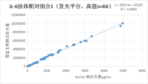 西寶IL-6抗體配對(duì)1中值部分(<1000pg/mL)的發(fā)光值與Roche IL-6試劑臨床相關(guān)性R2>0.95;